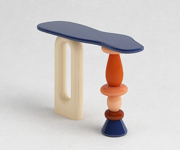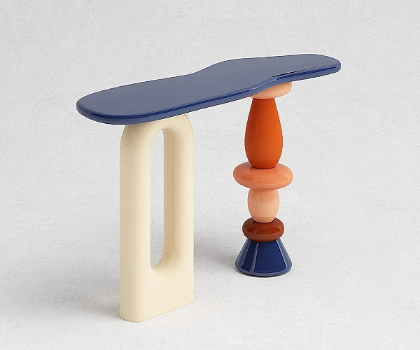 An elongated top with softened corners rests on two distinct supports – one an open arch, the other a stacked column of rounded volumes. Narrow in depth and balanced in stance, the piece is designed to sit against a wall while holding sculptural presence.
