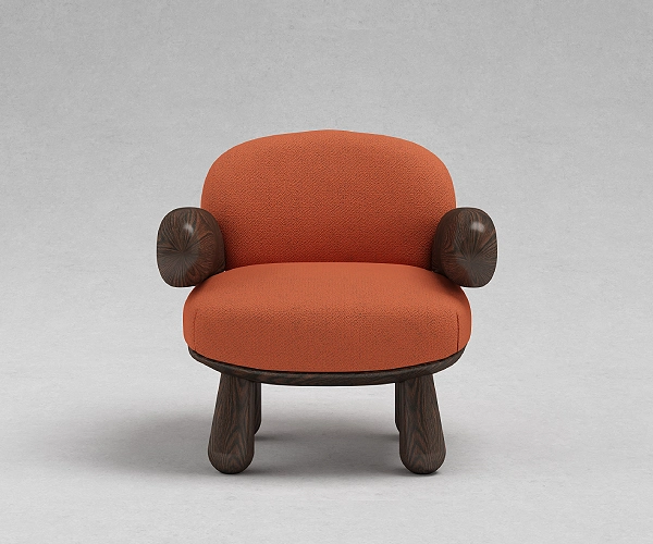A rounded upholstered seat and back rest within a sculpted wooden frame. Solid cylindrical arms extend forward, echoing the grounded legs below. Compact in scale yet weighty in presence.
