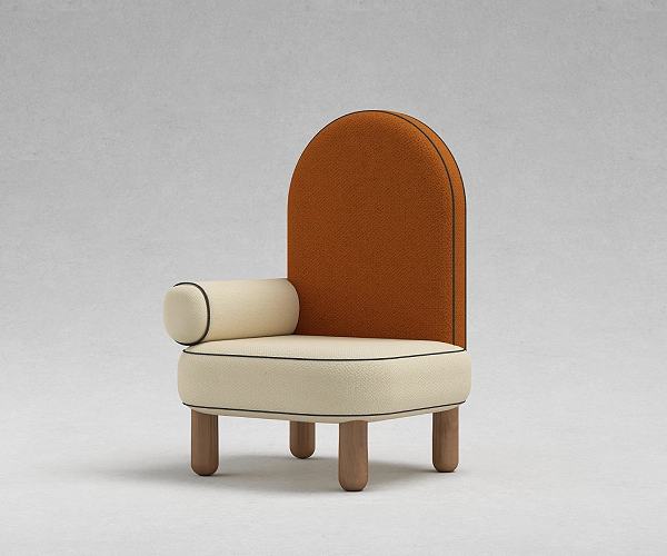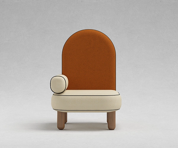 A tall arched back rises in burnt terracotta, edged with fine piping. A cylindrical bolster forms a single arm, offset against a generous rounded seat in ivory boucle. Resting on four solid wooden legs, the composition balances softness with structure, symmetry with interruption.